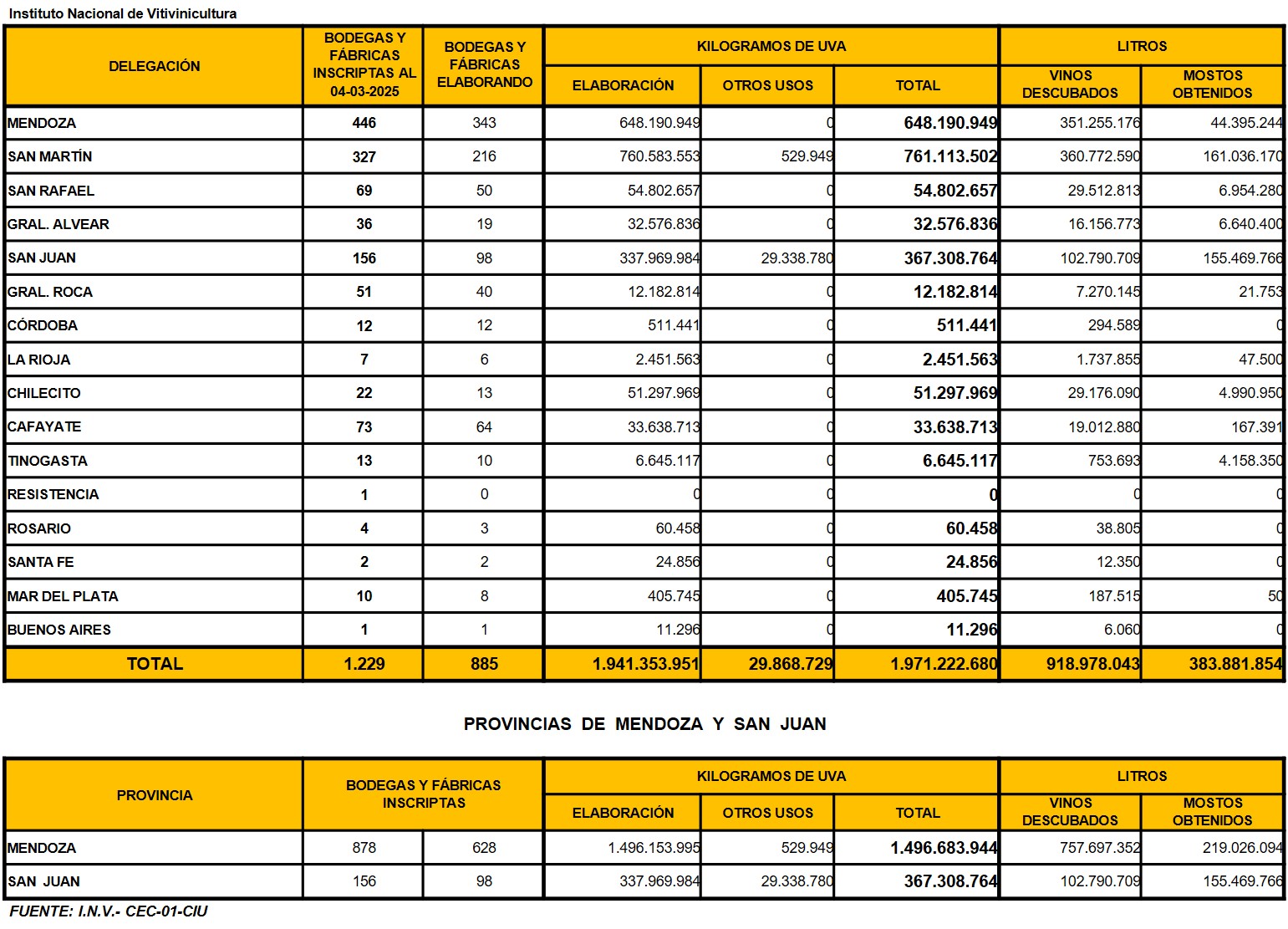El 12vo. informe de cosecha de 2025 publicado por el Instituto Nacional de Vitivinicultura (INV), correspondiente a la semana 21 de la vendimia, muestra un crecimiento del 4,6% respecto a 2024. Con los 1.971.222.680 kg de uva se llevan elaborados 918.978.043 litros de vino y 383.881.854 de mosto.