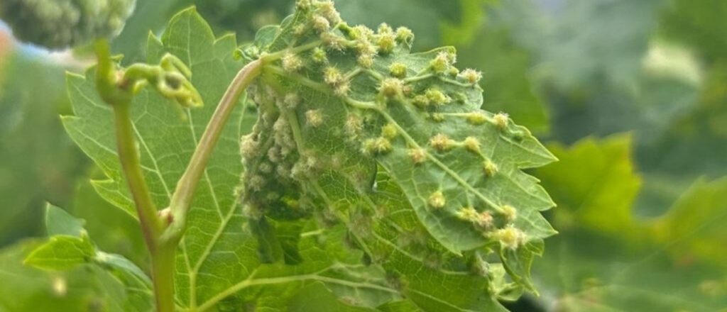 En hojas da lugar a la formación de agallas provocadas por las picaduras de este insecto que son visibles en el envés de las mismas y que se corresponden con lesiones cloróticas visibles en el haz. A nivel radicular, también se observa en las raicillas la presencia de nódulos y tuberosidades ligadas a dichas picaduras. Si los síntomas afectan a la raíz principal, la vid inevitablemente se marchitará entre los dos y los cinco años después de la infestación, provocando su muerte.