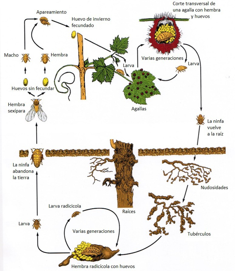 El insecto Phylloxera vastatrix, hoy denominado Daktulosphaira vitifoliae es un áfido o pulgón pequeño pero letal, picador y de un polimorfismo muy marcado. Las formas partenogenéticas son ápteras, de color variable entre el amarillo y el ocre y de un tamaño variable entre 0,3 mm y 1,4 mm. Se encuentra de dos formas, gallícolas (que viven sobre las hojas, formadora de agallas) y radicícolas (que viven en las raíces, formadora de nódulos o tuberosidades.). Lo que se encontró en la actualidad es un resurgimiento de ataques foliares de la forma gallícola sobre los injertos de vid europea en determinados lugares sin que esto sea perjudicial por el momento para la cosecha.