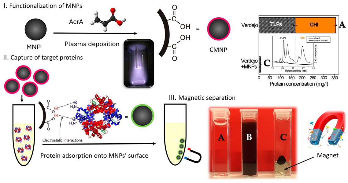 Además, se han desarrollado métodos de separación magnética utilizando nanopartículas superparamagnéticas de óxido de hierro (Fe₃O₄) para aislar eficientemente las células de levadura en la producción de vinos espumosos, lo que reduce considerablemente el tiempo y el coste en comparación con los métodos tradicionales. Estas nanopartículas magnéticas también se han empleado para eliminar aminas biógenas —subproductos de la fermentación que pueden comprometer la seguridad y calidad del vino—, así como proteínas relacionadas con la patogénesis que afectan la estabilidad coloidal del vino.