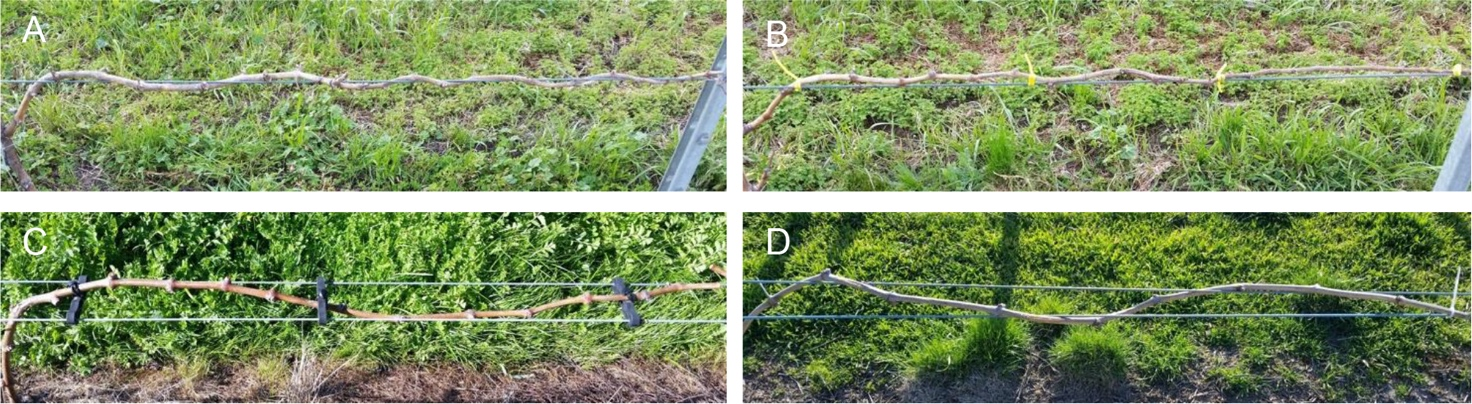 Se aplicaron tres técnicas de conducción del cordón permanente en las vides recientemente planteadas, que consistieron en el amarrado fuerte de los cordones alrededor del alambre, poner los cordones por encima del alambre, y serpentear los cordones mediante un sistema de clips plásticos centrados entre dos alambres paralelos (Figura 1A-C). Se aplicó una cuarta técnica a las vides retrabajadas que consistió en amarrar los cordones de manera suelta alrededor de dos alambres paralelos (Figura 1D).
