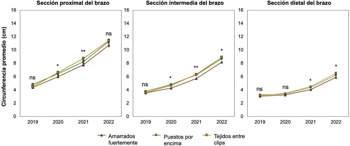 En las temporadas tardías de observación, las circunferencias de los cordones amarrados fuertemente se encontraban significativamente reducidas en comparación con los otros métodos de conducción. Estos resultados se alinean con los obtenidos en un estudio previo conducido por Caravia et al. (2015)1, quien encontró que las mediciones del área transversal de los brazos eran menores en la porción distal de los brazos amarrados en comparación con los brazos no amarrados en una prueba similar después de un periodo vegetativo.