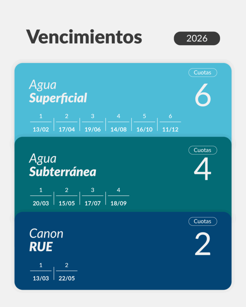 Con el comienzo del año, el Departamento General de Irrigación (DGI) de Mendoza publicó en su sitio web www.irrigacion.gov.ar el calendario de pagos 2026. El primer tributo en vencer es el canon de agua superficial, cuya opción de pago anual y primera cuota vence el 13 de febrero. En tanto que, el tributo de RUE (control de contaminación) vence el 13 de marzo y el de agua subterránea, el 20 de marzo.