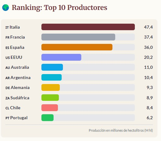 Italia sigue siendo el mayor productor mundial de vino en 2025 (47,3 Mhl), por delante de Francia (35,9 Mhl) y España (29,4 Mhl). Estados Unidos ocupa el cuarto lugar, mientras que Australia se recupera de la menor cosecha de 2024 y recupera su puesto como quinto productor mundial en 2025, por delante de