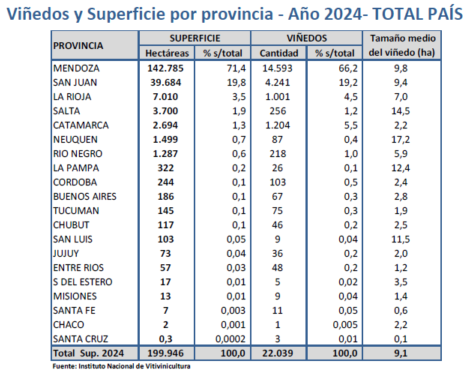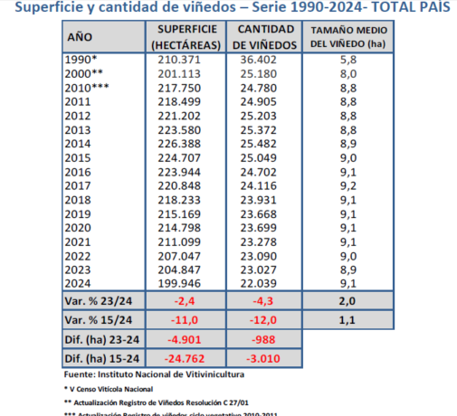 La superficie de vid de Argentina registrada al 31 de diciembre de 2024 alcanza las 199.946 ha distribuidas en 22.039 viñedos. Se registra una disminución del 11% en superficie total (-24.762 ha) en los últimos 10 años y del 12% en la cantidad de viñedos (-3.010). La tendencia indica que el tamaño de los viñedos (tmv) se ha incrementado, llegando en 2024 a 9,1 ha. El tmv en el año 1990 era de 5,8 ha; en el año 2000 de 8,0 ha; en 2010 de 8,8 ha y en el año 2024 de 9,1 ha.