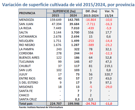 Respecto al año 2015 (10 años), han disminuido las hectáreas de vid en 5 de las 7 provincias con mayor superficie: Mendoza (-10,6%, -16.864 ha), San Juan (-16,3%, -7.711 ha), La Rioja (-5,9%, -439 ha), Neuquén (-14,4%, -253 ha) y Río Negro (-23,2%, -389 ha); mientras crecieron Salta (+17,7%, +556 ha) y Catamarca (+0,6%, +15 ha).