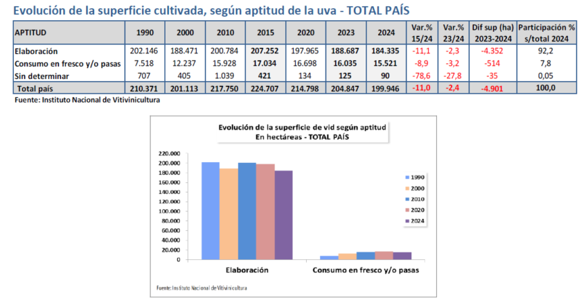 Las variedades aptas para elaboración concentran el 92,2% del total de la superficie y registraron una disminución de 4.352 ha en el último año, con bajas tanto en las variedades tintas (-1.299 ha) como en blancas (-983 ha) y rosadas (-2.070 ha). Las variedades aptas para consumo en fresco y/o pasas concentran el 7,8% de la superficie total y disminuyeron 514 ha en el último año, principalmente en las variedades blancas (-455 ha).