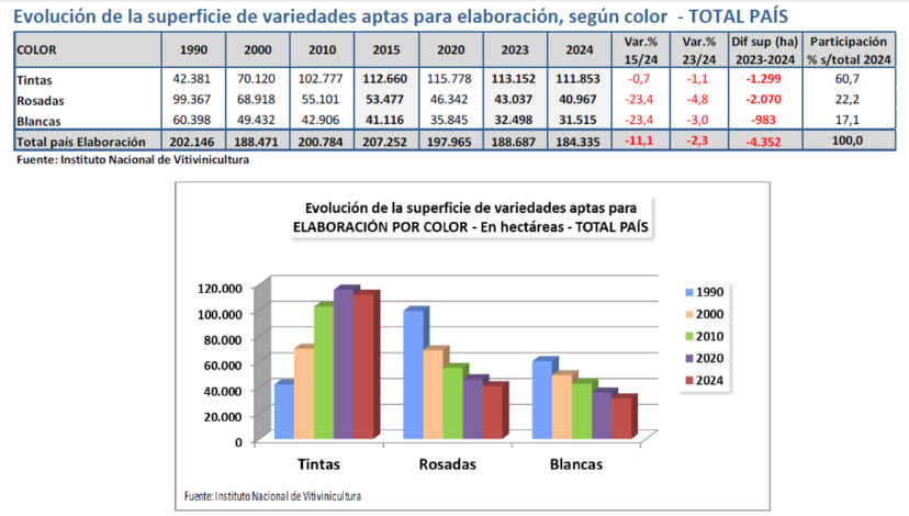 En el total de uvas aptas para elaboración de vinos y mostos, predominan las variedades tintas, que representan el 60,7% del total de este segmento, el 22,2% son rosadas y 17,1% son blancas. En la última década han disminuido las variedades tintas un 0,7%, las rosadas un 23,4% y las blancas también bajaron un 23,4%. En el último año la disminución de tintas fue del 1,1% (-1.299 ha), las rosadas disminuyeron 4,8% (-2.070 ha) y las blancas mermaron un 3% (-983 ha).
