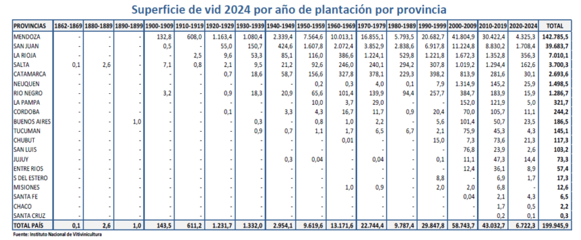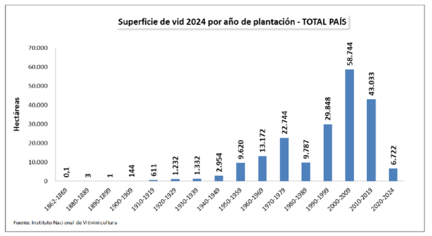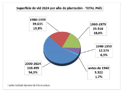 El 54,3% de la superficie de vid del país se ha implantado luego del año 2000 (108.499 ha). En el otro extremo, se registra un 8% (15.896 ha) de la superficie plantada antes de 1960. Las plantaciones más antiguas del país se registran en la provincia de Salta y datan del año 1862.