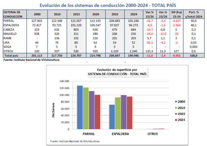 La tendencia indica que el sistema de conducción que disminuye a lo largo de los años es el parral y aumenta la espaldera, aunque en el último año también ha disminuido este sistema. Respecto al año 2023, el parral disminuyó en 3.437 ha y la espaldera bajó 1.564 ha. Se registra un aumento de 5 ha en el sistema cabeza y de 2 ha en ramé.