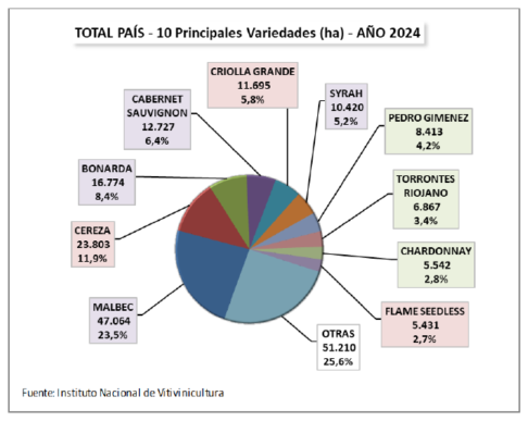 Las variedades más cultivadas en el país son: Malbec (23,5%), Cereza (11,9%), Bonarda (8,4%), Cabernet Sauvignon (6,4%) y Criolla Grande (5,8%). La variedad que sigue aumentado superficie a lo largo de los años es Malbec, creció 7.578 ha en los últimos 10 años, llegando a las actuales 47.064 ha. Le sigue en importancia por su crecimiento en este período: Ancellota (+1.645 ha), Flame Seedless (+1.365 ha), Fiesta (+1.342), Cabernet Franc (+1.173 ha) y Aspirant Bouschet (+393 ha).