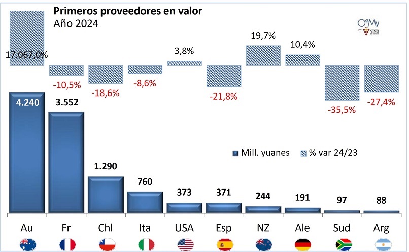 China importó vino desde 56 proveedores mundiales en 2024. Como hemos adelantado, destaca el aumento de los vinos australianos en China, que se recuperan parcialmente tras desplomarse después de la entrada en vigor de unos aranceles chinos del 200% a sus vinos, en noviembre de 2020. En marzo de 2024, China retiró estos aranceles a los vinos australianos, cuyas ventas pasaron de 24,7 millones de yuanes en 2023 a casi 4.240 millones en 2024 y de 1,6 millones de litros en 2023, a 78,6 millones en 2024. Sin embargo, todavía se encuentra lejos de las cifras de 2019, cuando se situaron en los 5.974,5 millones de yuanes.