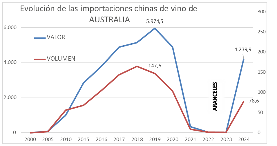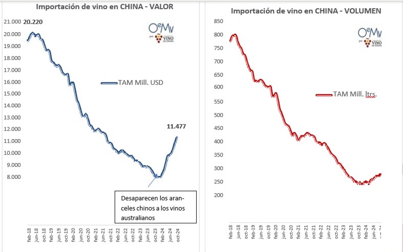 China aumentó sus importaciones de vino un 13,7% en volumen y un 39,6% en valor en 2024, hasta los 283,1 millones de litros y los 11.474,4 millones de yuanes (unos 1.523,7 millones €). Tras caer de forma consecutiva desde 2019, cierran 2024 en positivo, pero sin alcanzar los niveles de 2017 y 2018. Este repunte se explica por la recuperación en China de los vinos australianos tras la retirada de los aranceles del 200% que tenían desde noviembre de 2020.