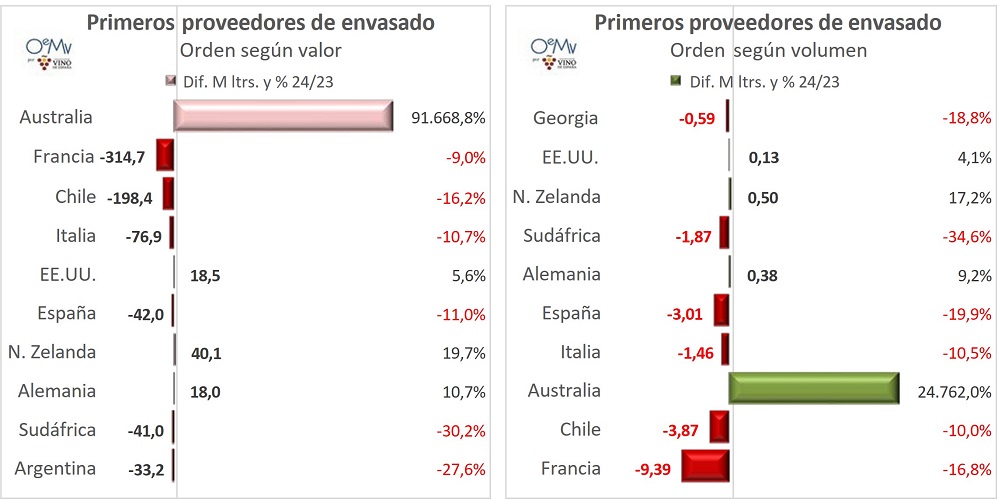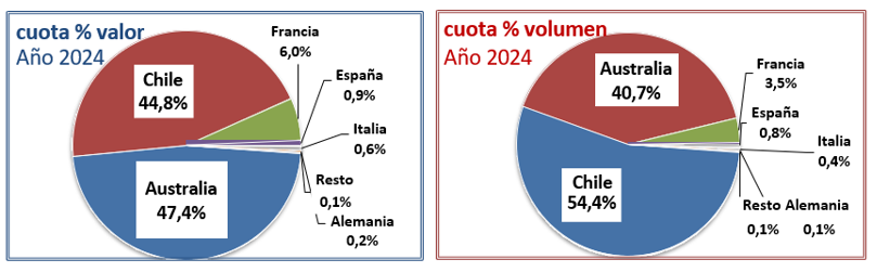 Chile se mantiene como principal proveedor en volumen, con 58,9 millones de litros (-17,7%), seguido de cerca por los 44 millones de litros de Australia, que cierra 2024 con un crecimiento del 3.255%, al pasar de apenas 1,3 millones de litros en 2023, a los 44 millones de 2024.