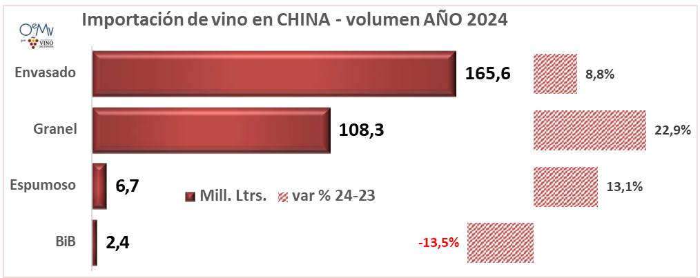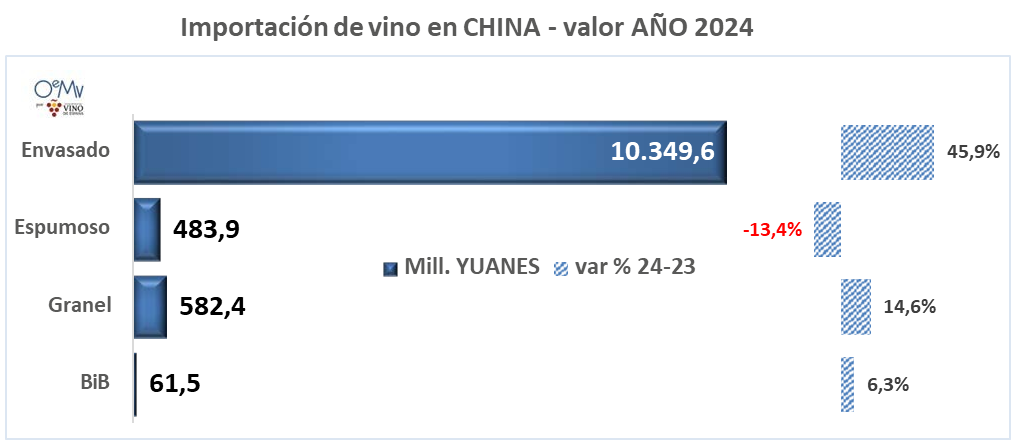China aumentó sus importaciones de vino envasado (+46% en valor y +8,8% en volumen). Es el producto más importado, con 10.349,6 millones de yuanes y 1656,6 millones de litros, el 90% del valor y el 58,5% del volumen total de vino importado por China en 2024.