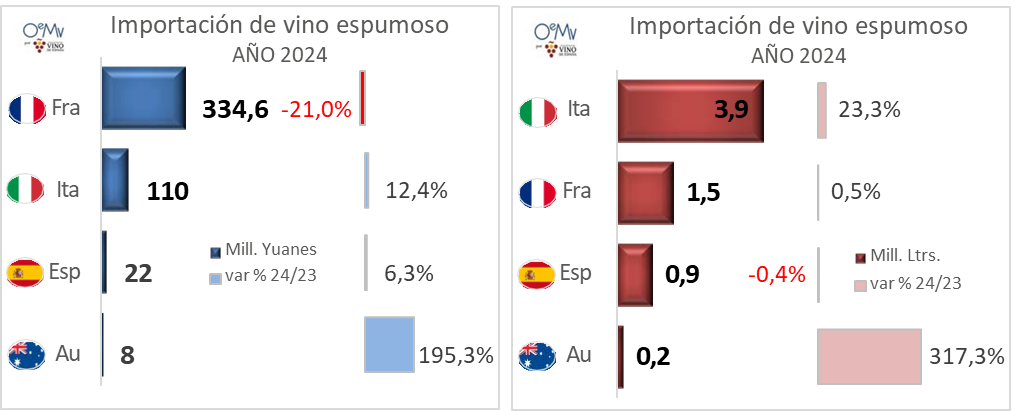 Francia supone el 69% del valor de las importaciones chinas de vino espumoso en 2024, con 334,6 millones de yuanes (-21%). En términos de volumen, es Italia el primer proveedor, con 3,9 millones de litros (+23%). Francia es el segundo proveedor en litros con 1,5 millones de litros (+0,5%), al tener un precio medio de 226,61 yuanes/litro, el más elevado entre los 10 primeros proveedores. Italia ocupa la 2ª plaza en valor, con 110 millones de yuanes (+12%).