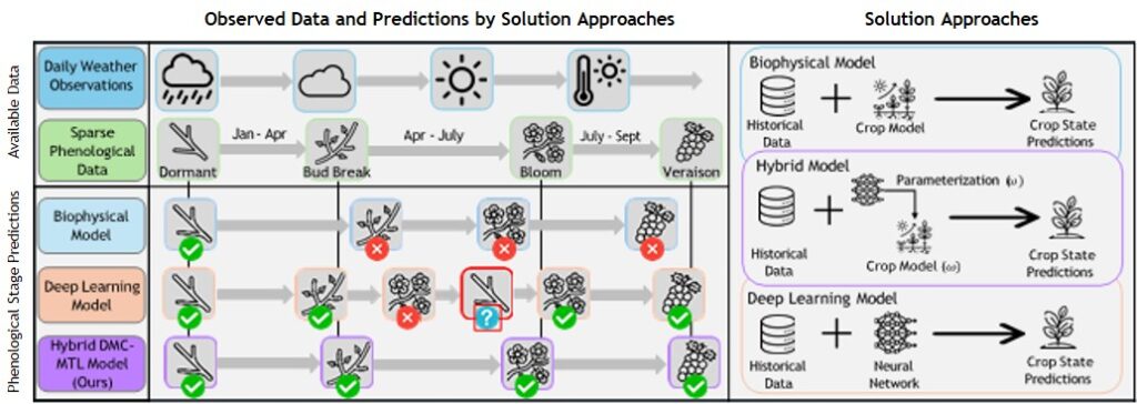 Sin embargo, predecir la fenología con precisión es un desafío debido a: 1) la disponibilidad limitada de datos históricos para la calibración por cultivar y las observaciones escasas durante cada temporada de crecimiento, y 2) la necesidad de modelar con precisión las complejas relaciones entre las variables meteorológicas diarias y la fenología. Los enfoques existentes para este problema suelen dividirse en dos categorías: modelos biofísicos mecanicistas y enfoques de aprendizaje profundo basados en datos.