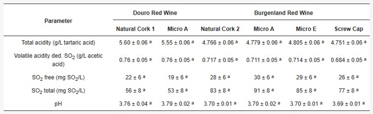 Según la Tabla 3, no se obtuvieron diferencias significativas (p > 0.05) para todos los parámetros estudiados en los vinos del Douro embotellados con Corcho Natural 1 y Micro A, que fueron almacenados durante 35 meses en posición horizontal. Se prestó especial atención a los niveles de SO₂ libre y total, ya que estos son los principales antioxidantes usados para preservar los vinos, proporcionando protección contra la oxidación y el deterioro microbiano. El índice de oxidación del vino se determina en base a la medición de los niveles totales de SO₂, que representan tanto las formas libres como las unidas de SO₂ que reaccionan con varios constituyentes del vino, tales como acetaldehído, antocianos, etc.