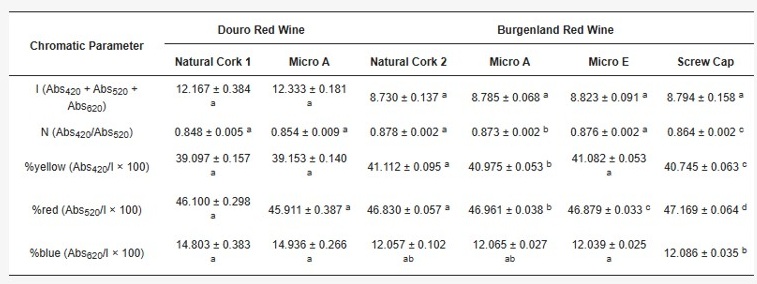 Los parámetros cromáticos, expresados por la intensidad de color, matiz y porcentaje de amarillo, rojo y azul, para los vinos del Douro y Burgenland sellados con diferentes cierres, se presentan en la Tabla 4. Como se muestra en esta tabla, no se observaron diferencias estadísticamente significativas (p > 0.05) entre los vinos del Douro embotellados con Corcho Natural 1 y Micro A. Esto es consistente con estudios previos, que demostraron que no se observan diferencias entre vinos embotellados con tapones de corcho natural y micro-aglomerado.