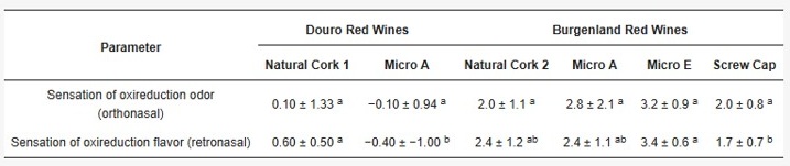 Para los vinos de Burgenland almacenados durante 5 meses, se utilizó una escala de 1 a 4, donde 1 representaba el carácter más reductivo y 4 el más oxidado. Para la percepción ortonasal, no se observaron diferencias estadísticas significativas (p > 0.05) entre los vinos embotellados con diferentes cierres, como se describió anteriormente para los vinos del Douro, con tiempos de almacenamiento más largos (35 meses). Por otro lado, para la percepción retronasal, no se observaron diferencias significativas (p > 0.05), con la excepción de los vinos sellados con Micro E y tapón de rosca (p < 0.05). Aunque no se notaron diferencias estadísticamente significativas, cabe destacar que los vinos sellados con tapón de rosca tendieron a exhibir un carácter más reductivo a nivel retronasal.