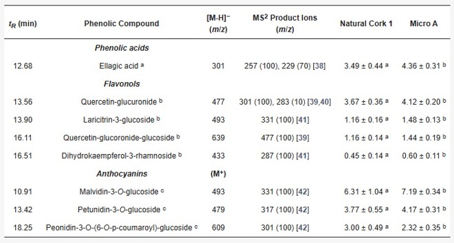 De los 25 compuestos identificados y cuantificados en los vinos tintos de Douro (Tabla S1 del Material Suplementario), solo 8 compuestos mostraron diferencias significativas entre los vinos sellados con diferentes tapones (1 ácido fenólico, 4 flavonoles y 3 antocianinas), los cuales estuvieron presentes en cantidades ligeramente menores en los vinos embotellados con Corcho Natural 1. Sin embargo, la magnitud de esta variación es sutil, con cambios inferiores a 0.25 veces (Tabla 6). Los ligeros cambios en el perfil fenólico de los vinos sellados con diferentes cierres pueden ser resultado de un balance entre migraciones provenientes de los cierres de corcho y/o modificaciones químicas que pueden ocurrir bajo condiciones post-embotellado. Por ejemplo, un ambiente oxidativo favorecido por los cierres puede promover reacciones de polimerización oxidativa, que causan una rápida disminución de antocianinas libres. Los flavanoles también pueden participar en reacciones redox. En cuanto a la migración de polifenoles desde el corcho al vino, un estudio previo mostró que los tapones de corcho natural y los de corcho aglomerado presentaron un comportamiento similar, sin diferencias significativas observadas.