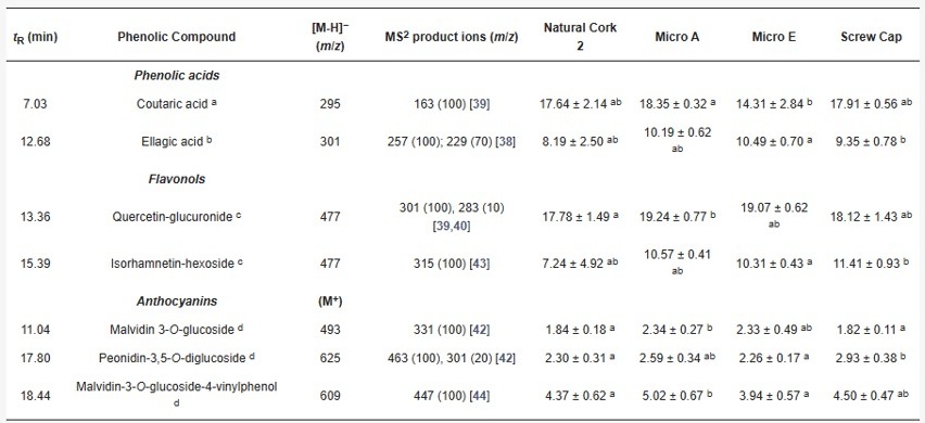 No existe evidencia de cambios significativos en los niveles totales de compuestos fenólicos entre vinos sellados con diferentes cierres. Sin embargo, considerando que el Corcho Natural 1 tiende a presentar un OTR más alto en comparación con Micro A (Figura 1), se puede inferir que el OTR puede impactar la evolución de los compuestos fenólicos en vinos tintos de Douro usando diferentes tipos de tapones. Estos resultados también pueden correlacionarse con el análisis sensorial, que mostró que el vino sellado con Corcho Natural 1 exhibió un nivel ligeramente mayor de oxidación en la percepción retronasal. Sin embargo, no se observó una asociación clara entre la evolución de los perfiles fenólicos y las propiedades cromáticas de los vinos, lo que parece lógico dado que los cambios son muy sutiles.