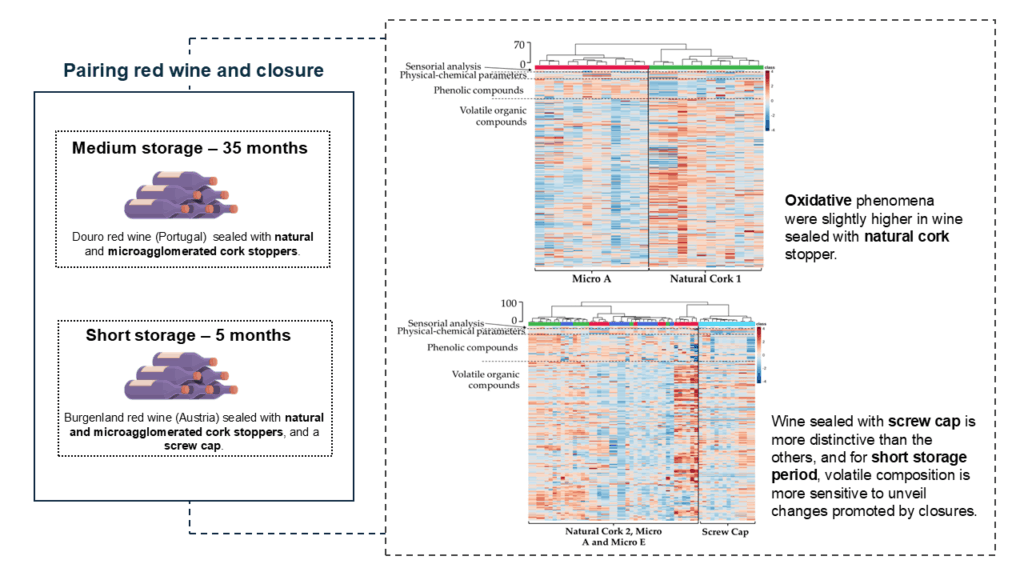 Investigadores de la Universidad Aveiro de Portugal, con la colaboración de la empresa portuguesa de corchos MA Silva -representada en Argentina por la firma Real de la Cruz, con sede en Mendoza- exploraron los efectos de diferentes sistemas de cierre, tales como el corcho natural, microaglomerado y tapones de rosca, en la evolución del vino tinto durante períodos de conservación a corto y medio plazo (5 y 35 meses). Los resultados revelaron que cada tipo de cierre creó ambientes distintos dentro de las botellas, influyendo en la oxidación, la reducción y la evolución fenólica y aromática del vino, de modo que cada combinación podría servir como herramienta enológica.