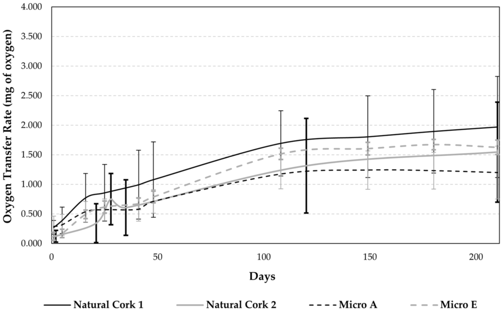 La tasa de transferencia de oxígeno (OTR, por sus siglas en inglés), expresada en miligramos de oxígeno por botella, fue monitorizada durante 210 días (Figura 1) para tapones de corcho natural y de corcho micro-aglomerado. Al finalizar este período, el Corcho Natural 1 alcanzó 1.971 ± 0.854 mg de O₂, el Corcho Natural 2 logró 1.546 ± 0.846 mg de O₂, el Micro A registró 1.200 ± 0.446 mg de O₂ y el Micro E mostró 1.627 ± 0.121 mg de O₂, lo que corresponde a una variabilidad, expresada como desviación estándar, del 43%, 55%, 37% y 5%, respectivamente.