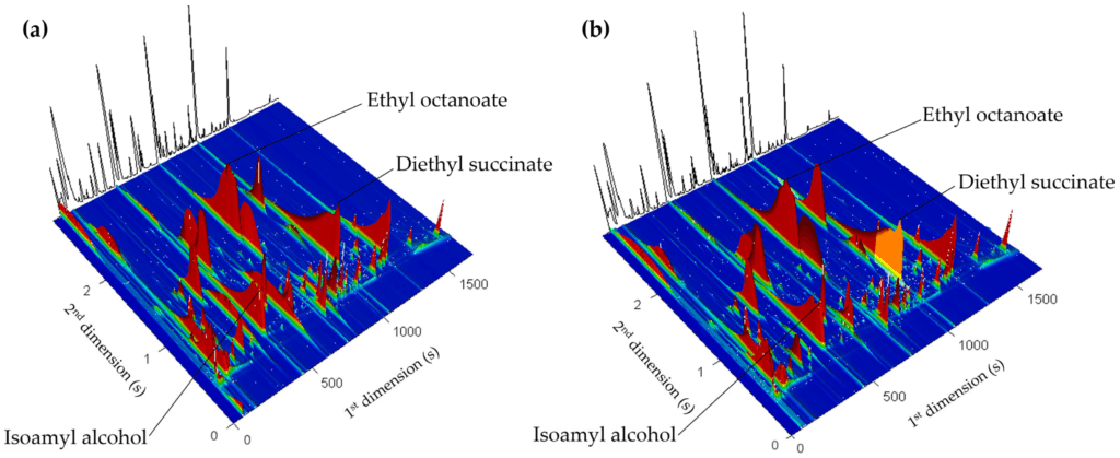 La composición volátil de los vinos fue evaluada usando HS-SPME/GC × GC-ToFMS, y se proporcionan los cromatogramas tridimensionales de corriente total de iones (TIC) para vinos de Douro embotellados con Corcho Natural 1 y Micro A en las figuras 2a y 2b, respectivamente, para ilustrar los cromatogramas típicos obtenidos en este estudio. Esta técnica cromatográfica avanzada permite un análisis detallado y sensible de los compuestos volátiles, habilitando la identificación y cuantificación de mezclas complejas con alta resolución y mayor eficiencia de separación.
