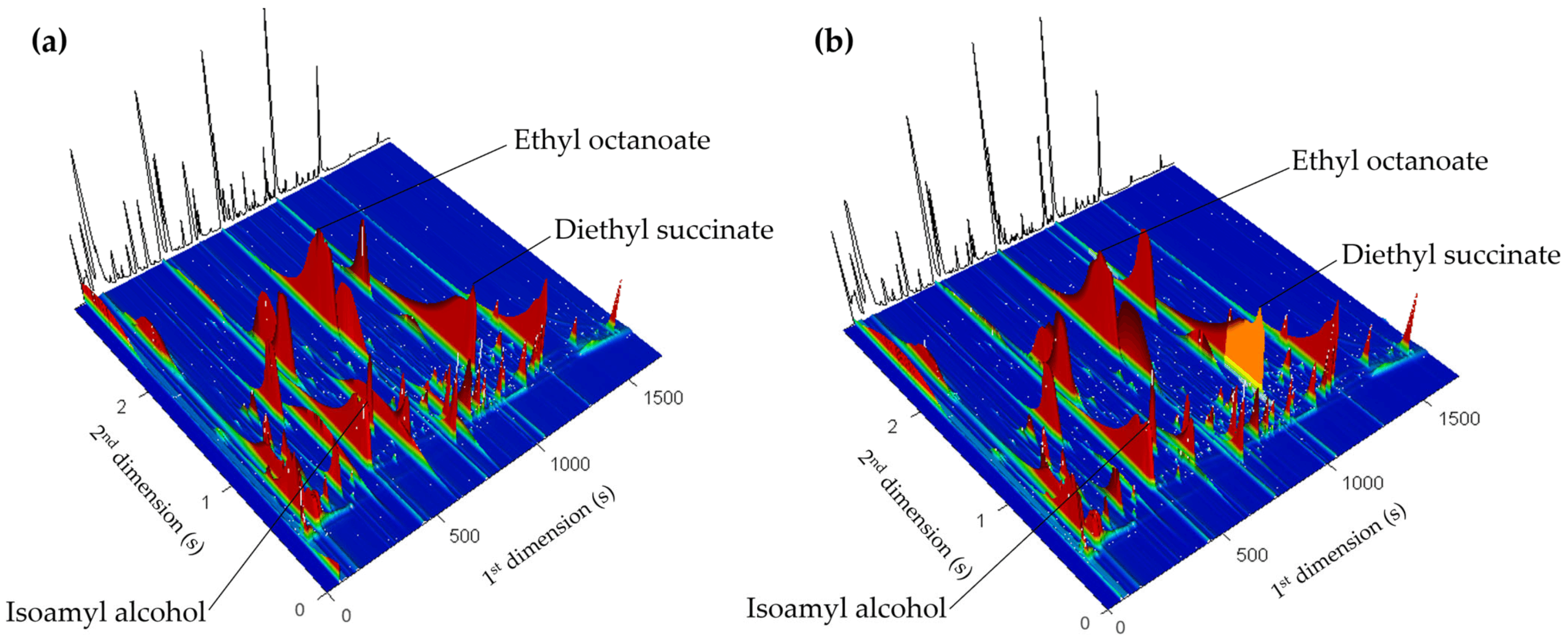 Los perfiles volátiles de ambos vinos parecen estar dominados por sólo unos pocos analitos altamente concentrados, tales como alcohol isoamílico (1tR = 435 s y 2tR = 0.592 s), octanoato de etilo (1tR = 738 s y 2tR = 1.864 s) y succinato de dietilo (1tR = 1032 s y 2tR = 0.992 s). De hecho, la composición volátil de los dos vinos parece similar a primera vista, ya que la escala de color está sesgada hacia estos analitos altamente concentrados. Sin embargo, se realizó un examen detallado de los cromatogramas para extraer datos relacionados con el nivel de complejidad química dentro de los vinos sellados con diferentes cierres y para determinar los analitos que pueden presentar diferencias notables de concentración entre estos vinos. El procesamiento de datos e identificación de compuestos detectados por GC × GC-ToFMS representa un gran desafío, especialmente para el procesamiento de datos con un gran número de analitos por muestra.