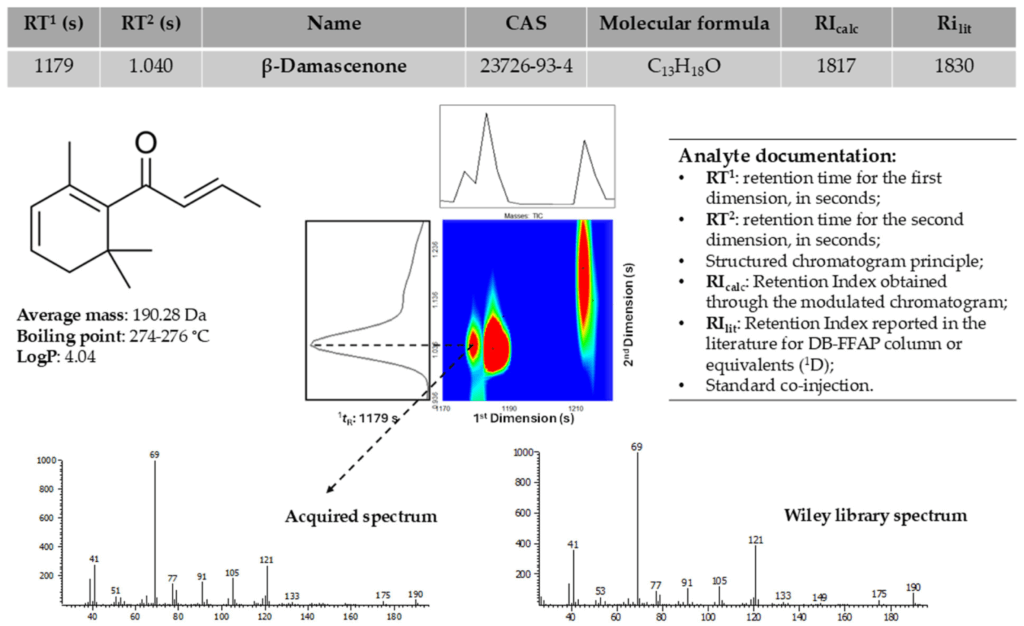 El análisis en profundidad de los datos incluyó la identificación de analitos presentes en los conjuntos de datos establecidos para cada ensayo (vinos tintos de Douro y Burgenland), como se muestra en la Figura 3, con el β-damascenona, que fue identificado en vinos sellados con diferentes cierres. Esta estrategia comprende una evaluación exhaustiva de varios parámetros experimentales obtenidos mediante análisis GC × GC, así como datos extraídos de bases de datos y las propiedades fisicoquímicas particulares de cada molécula. Este procedimiento, aunque laborioso, aumenta la confianza en la identificación de los analitos.