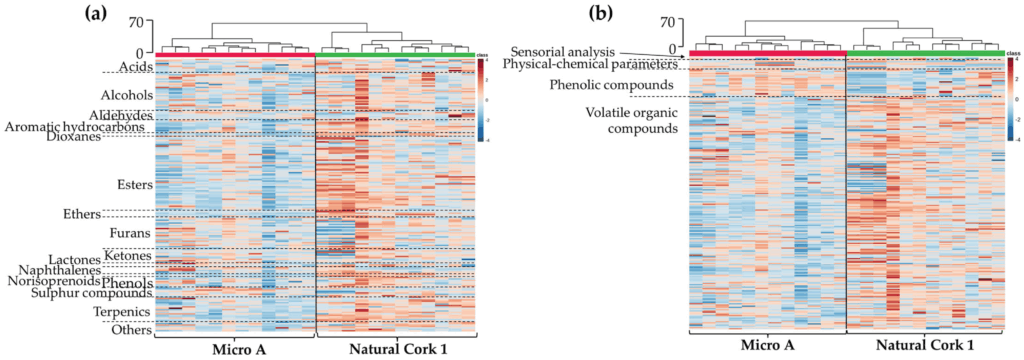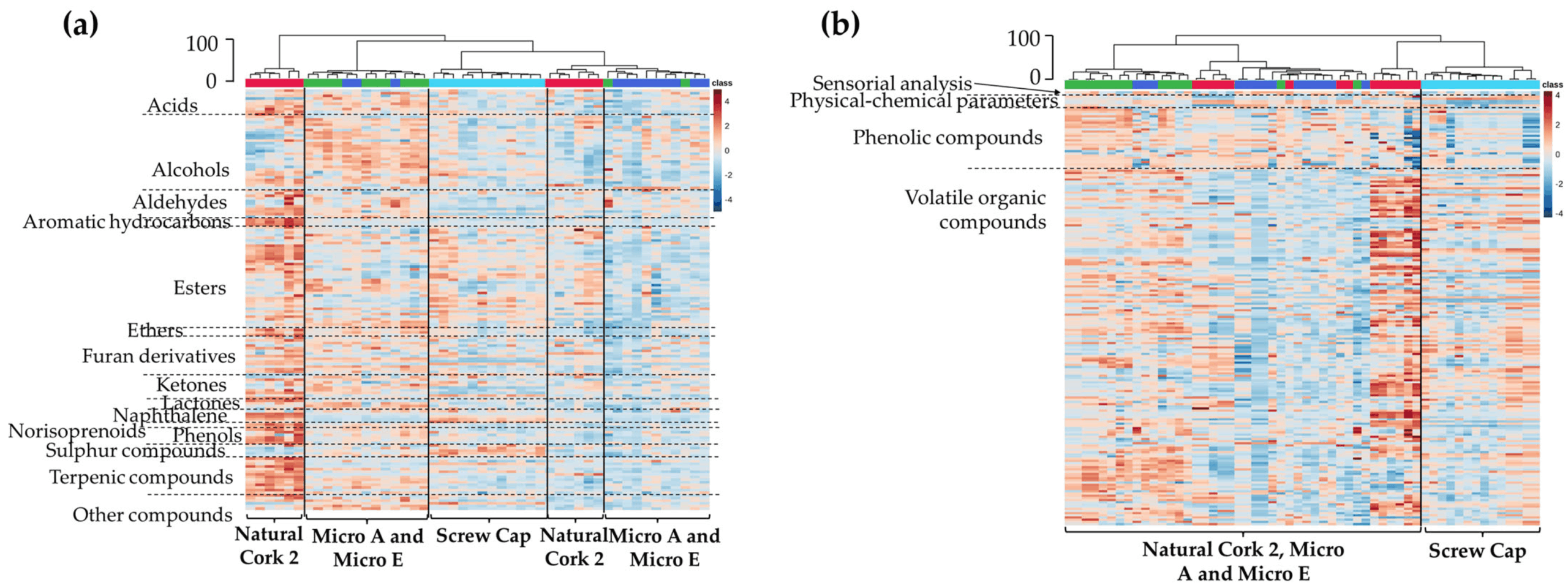 Para un acceso rápido y visual al patrón volátil de los vinos sellados con diferentes cierres, se realizó un análisis de agrupamiento (clustering), y el mapa de calor y el dendrograma muestran dos grupos principales correspondientes a los vinos sellados con Natural Cork 1 y Micro A (Figura 4a). El contenido de cada compuesto se ilustra mediante una escala cromática (de azul oscuro a rojo oscuro, representando el mínimo y el máximo, respectivamente) y revela que, en general, el vino sellado con Natural Cork 1 presentó mayores cantidades de compuestos volátiles.