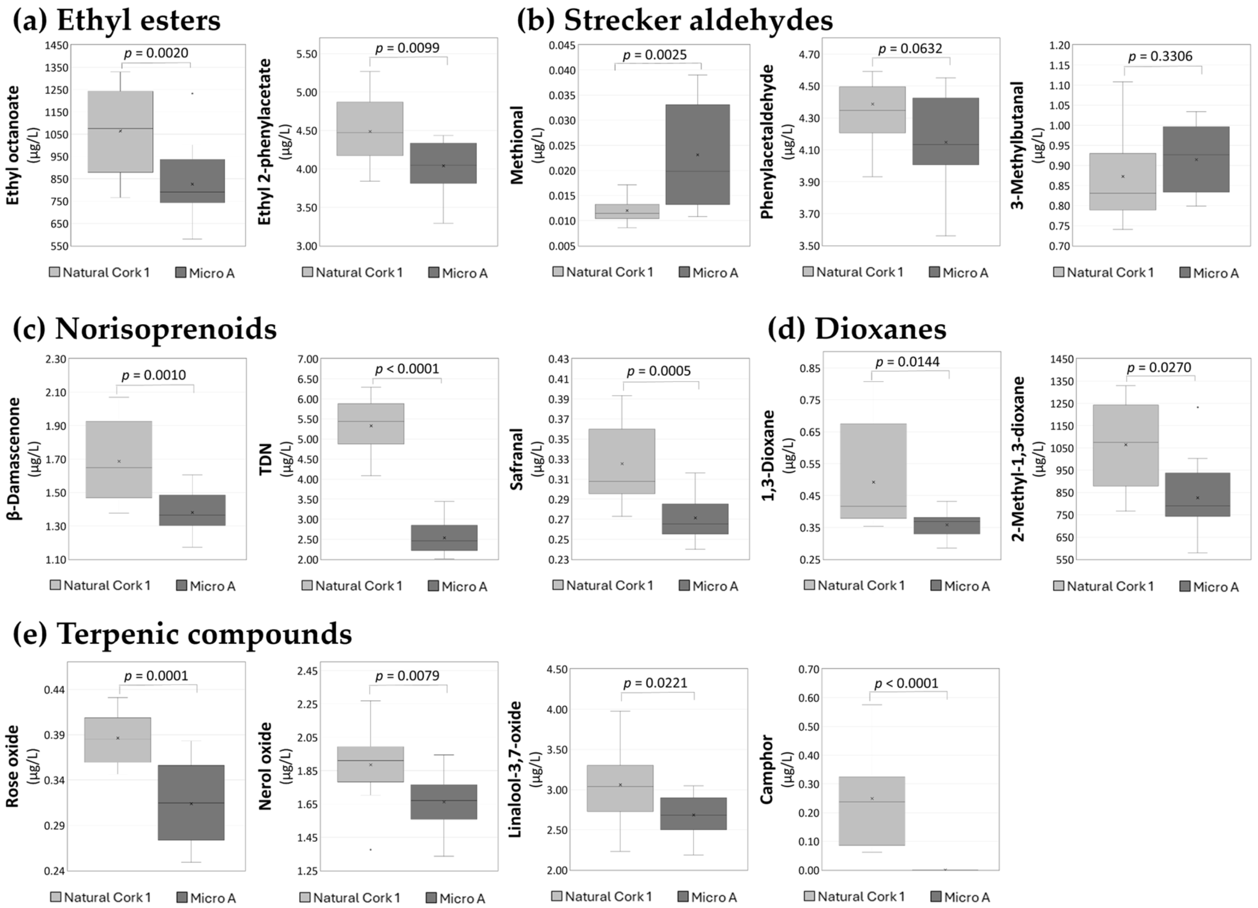 Entre los ésteres de etilo (Figura 5a), el acetato de etilo 2-fenilacetato también mostró concentraciones ligeramente más altas en el vino sellado con Natural Cork 1 (4.486 ± 0.426 µg/L) en comparación con el vino sellado con Micro A (4.039 ± 0.346 µg/L).