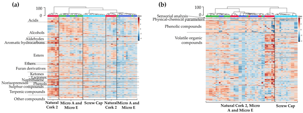 Se realizó un análisis de agrupamiento de los patrones volátiles en vinos de Burgenland embotellados con diferentes cierres, con la representación en mapa de calor y dendrograma revelando cinco grupos principales (Figura 6a), mostrando que los vinos sellados con tapa de rosca parecen ser más distintivos que los demás. Se observó mezcla en las ramas asociadas con vinos sellados con tapones de corcho micro-aglomerado de dos productores. Para los analitos que mostraron diferencias estadísticamente significativas entre al menos dos vinos embotellados con diferentes cierres, la magnitud promedio de variación fue menor a 0.25 veces.