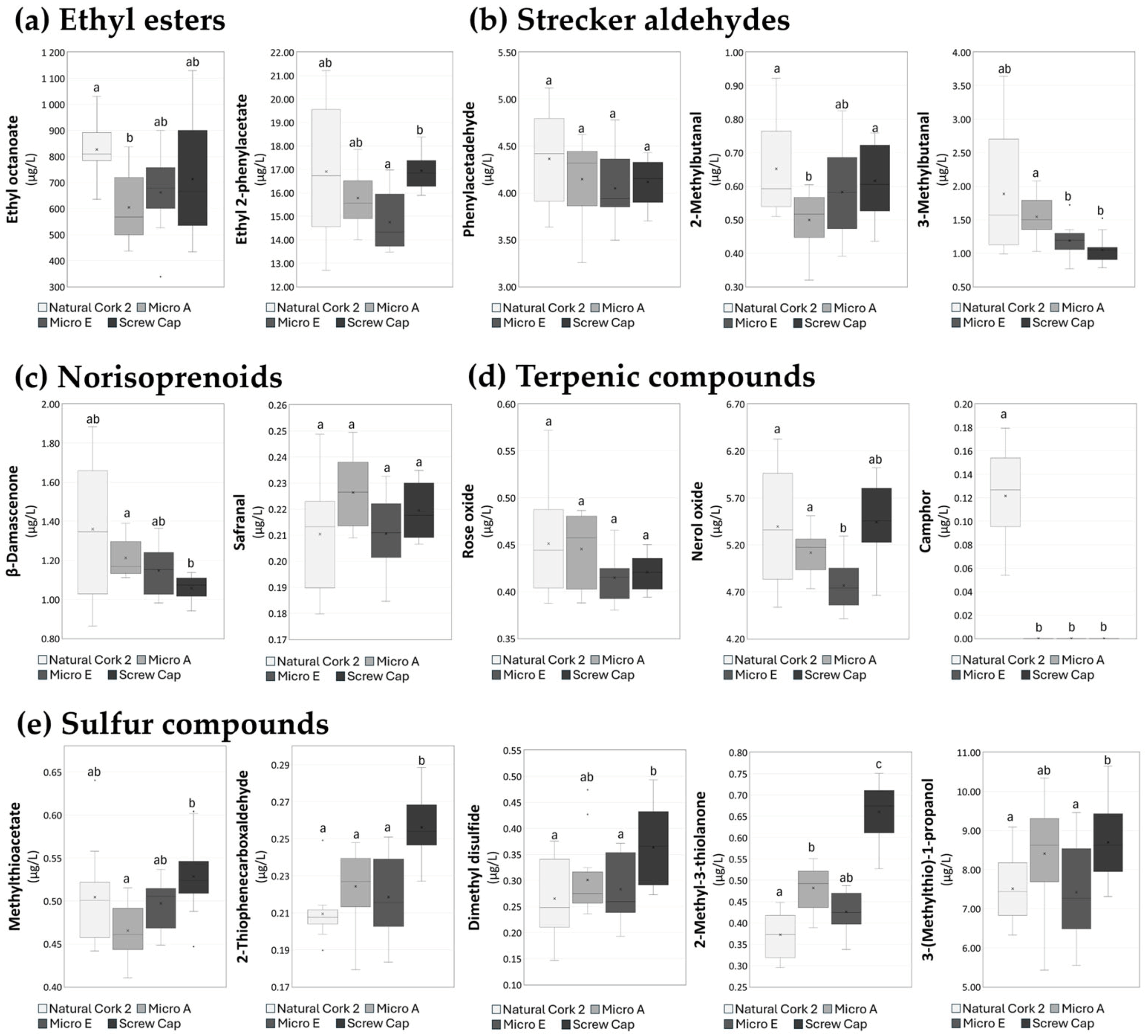 Un análisis más detallado de la composición volátil (Tabla S3 del Material Suplementario) destacó diferencias entre los perfiles volátiles de los vinos sellados con diferentes cierres, las cuales se discutirán a continuación.