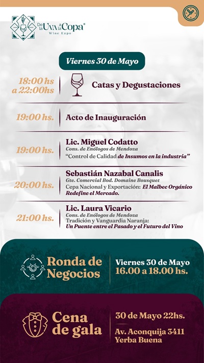 La Wine Expo De la Uva a la Copa ya arrancó en la ciudad de Tucumán, con el objetivo de promover el sector vitivinícola regional del Noroeste Argentino (NOA) y fortalecer la identidad cultural. Se desarrolla este viernes 30/5 y sábado 31/5 en las amplias instalaciones de la Sociedad Rural de esa capital provincial.