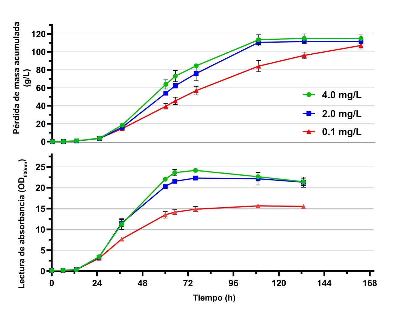 Las cinéticas de fermentación de Saccharomyces cerevisiae EC1118™ (Lallemand Inc, QC, Canadá) (Figura 1) fueron comparadas en un medio de mosto sintético de uva que contenía 230 g/L de azúcares (mitad glucosa, mitad fructosa), con tres concentraciones diferentes de ácido nicotínico (AN) a 25 ºC. Este rango abarcó los niveles de deficiencia (0,1 mg/L), promedio (2,0 mg/L) y exceso (4,0 mg/L) de vitamina típicamente medida en el mosto de uva, aunque las concentraciones reales pueden variar considerablemente.