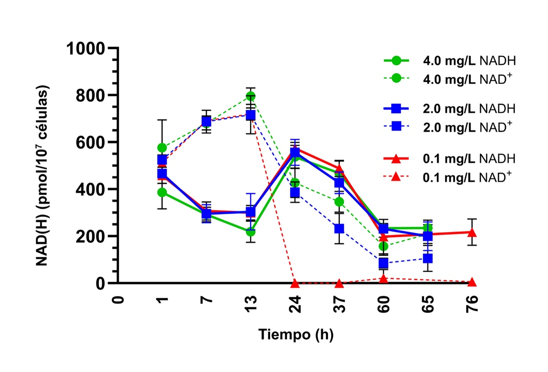 Las concentraciones de los cofactores redox NAD⁺ y NADH fueron cuantificadas a lo largo de la fermentación (Figura 2). Inicialmente, los niveles de NAD⁺ (la forma oxidada) aumentó hasta el final de la fase de latencia (13 h). Cuando las células transitaron a la fase exponencial, los niveles de NAD⁺ cayeron drásticamente en cada tratamiento, reflejando el arranque de la actividad metabólica y un aumento en la tasa de crecimiento celular. Durante esta fase, el NAD⁺ es rápidamente reducido a NADH, que se acumula durante la glucólisis y el ciclo de los ácidos tricarboxílicos. La producción de etanol, dióxido de carbono y otros metabolitos refleja la estrategia de la levadura para mantener el balance entre los cofactores oxidados y reducidos.