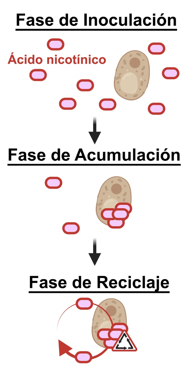 Se determinó la importación y el destino metabólico del AN, y se esbozó bajo la forma de un esquema simplificado en la Figura 3. La primera fase ocurre inmediatamente después de la inoculación, cuando la levadura se adapta al ambiente del mosto de uva incrementando gradualmente su metabolismo, movilizando sus reservas de vitamina B3 e importando el AN como substrato para la síntesis de NAD⁺. Esta es seguida por una fase de acumulación, en la que las células consumen rápidamente todo el AN disponible en el medio. Esto se alcanza antes del 50 % del crecimiento máximo de la levadura.