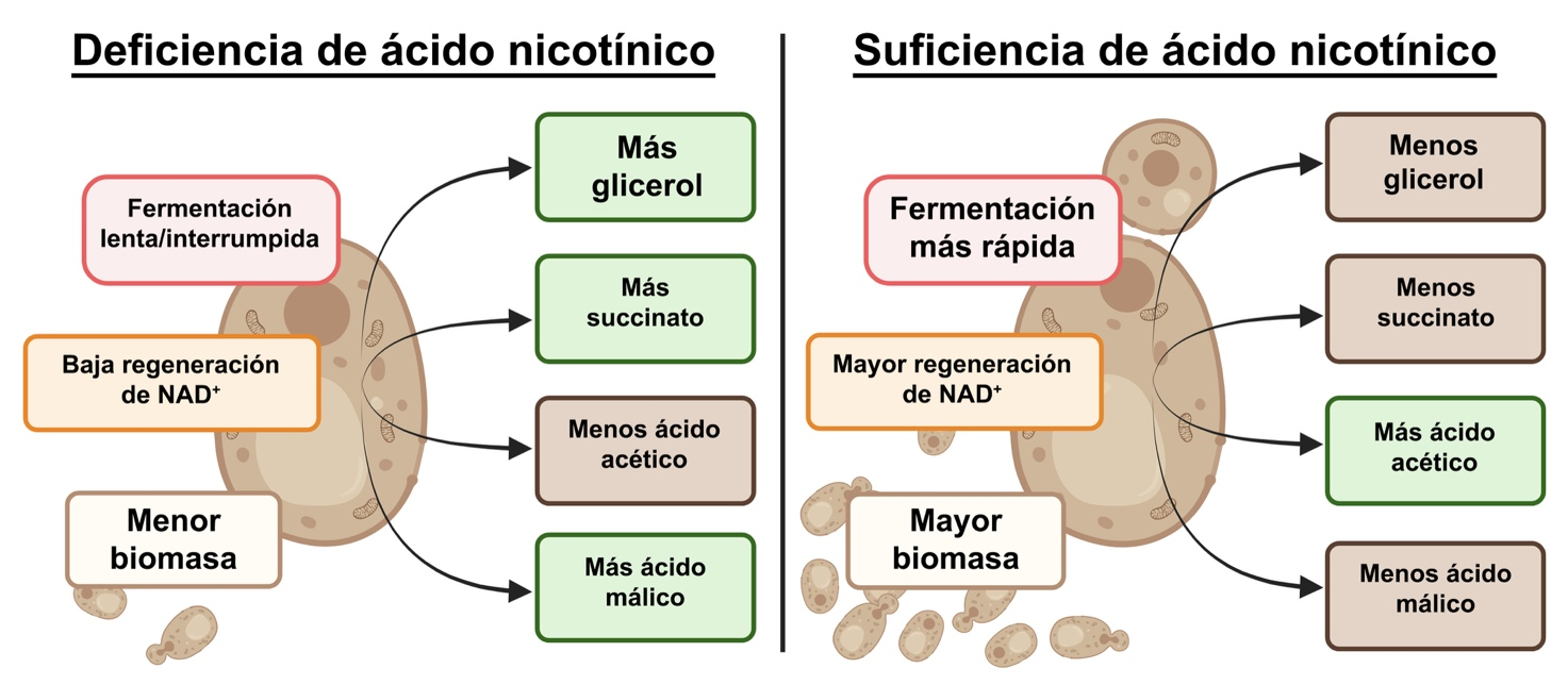 El ácido nicotínico (AN), una forma de la vitamina B3, es un precursor de los cofactores redox esenciales NAD⁺ y NADP, los cuales son vitales para varios procesos metabólicos. En Saccharomyces cerevisiae, la producción de estos cofactores bajo condiciones anaeróbicas ocurre exclusivamente mediante la recuperación de varias formas de la vitamina B3, enfatizando la importancia de la disponibilidad de AN en el mosto de uva. En este estudio se investiga el impacto de la deficiencia de AN en el desempeño de la fermentación en S. cerevisiae y el subsecuente impacto en la impronta metabólica del vino.