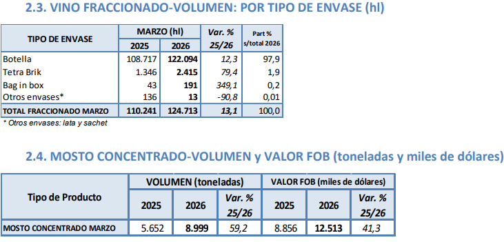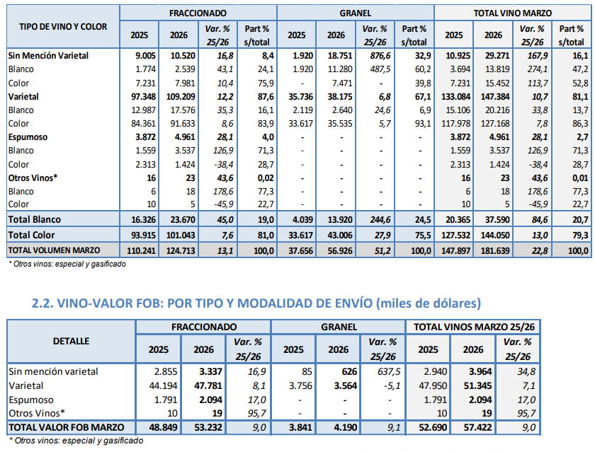 La industria vitivinícola argentina mostró señales de recuperación en sus ventas al exterior en el primer trimestre de 2026. Según el último informe del Instituto Nacional de Vitivinicultura (INV), las exportaciones totales de vino registraron un incremento del 22,8% en promedio en el mes de marzo de 2026 en comparación con el mismo mes de 2025. Los envíos de vino a granel lideraron esa suba, con un aumento del 51,2% en ese período, totalizando los 18.163.900 litros vendidos en marzo 2026. En tanto, el crecimiento de las exportaciones de mosto en marzo 2026 fue del 59,2%, con un total de 8.999 toneladas vendidas.