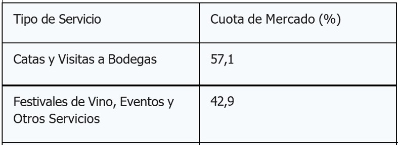Por tipo de servicio: Los servicios ofrecidos dentro del panorama del enoturismo son diversos, pero están dominados por dos categorías principales: experiencias en bodegas in situ y eventos regionales más grandes.