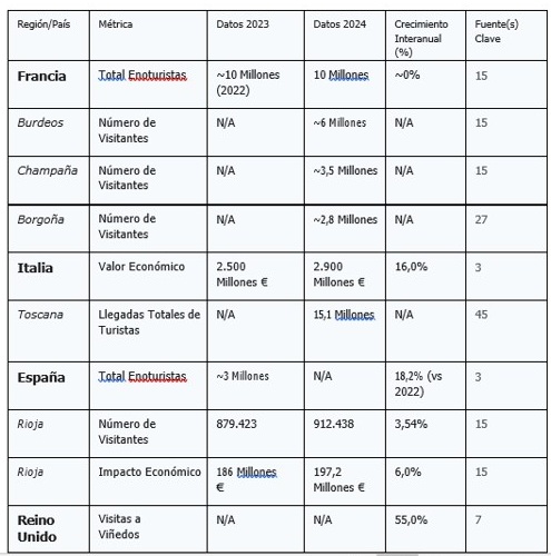 - España en 2023 recibió casi 3 millones de enoturistas, un aumento del 18,2% con respecto a 2022, con Rioja como región líder, donde en 2024, las bodegas atrajeron un récord de 912.438 visitantes, un aumento del 3,54% con respecto a 2023. El impacto económico de esta actividad aumentó a 197,2 millones de euros en 2024, un aumento sustancial desde los casi 186 millones de euros generados en 2023. La cuota de visitantes internacionales creció, representando el 36,3% del total, frente al 33% del año anterior, siendo Estados Unidos, Reino Unido y Francia los principales mercados de origen.