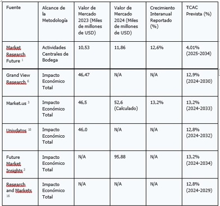 -Impacto Económico Total: presentan una visión más holística, ya que incorporan el significativo gasto auxiliar de los enoturistas en alojamiento, comidas en restaurantes locales, transporte y otras actividades culturales y recreativas dentro de una región vitivinícola. Este alcance más amplio da como resultado valoraciones sustancialmente más altas. Grand View Research y Market.us, por ejemplo, situaron el valor del mercado en 46.470 millones de dólares y 46.500 millones de dólares, respectivamente, para 2023. Otras empresas, como Univdatos, ofrecieron una cifra similar de 46.000 millones de dólares para el mismo año. Las proyecciones para 2024 de fuentes que utilizan esta metodología más amplia son aún más robustas, con Future Market Insights estimando el mercado en 95.880 millones de dólares.