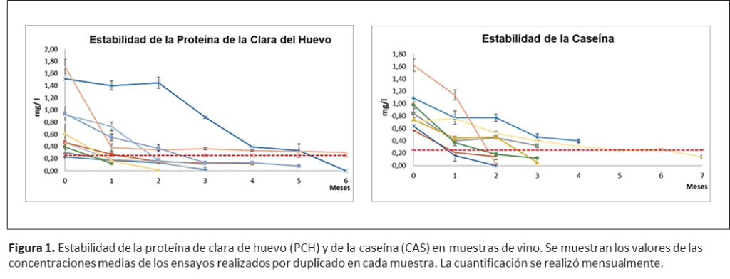 El estudio demostró la inestabilidad en el tiempo de las proteínas empleadas como clarificantes del vino (PCH y caseína) y que, por consiguiente, la fecha de análisis de estos alérgenos influye en su detección. La estabilidad de estas proteínas duró aproximadamente entre uno a seis meses, dependiendo de cada muestra de vino y fue independiente de su concentración inicial o de partida.