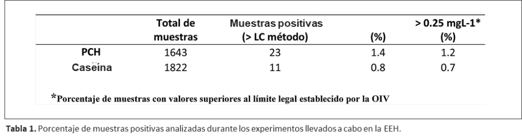 Durante el periodo de estudio, de 1643 muestras analizadas para PCH y 1822 para caseína, sólo el 1,2% y el 0,7 % respectivamente superaron el límite establecido (0,25 mg/l). Dieciocho de estas muestras con diferentes concentraciones de alérgenos fueron seleccionadas para el estudio.