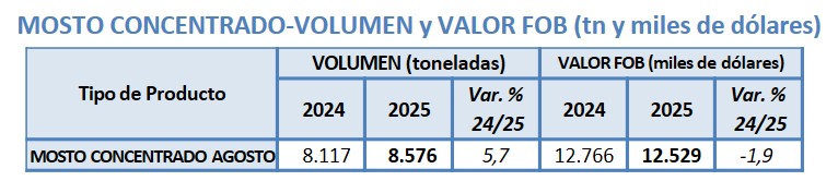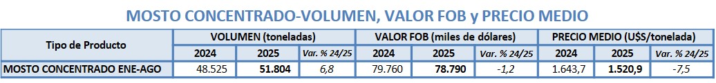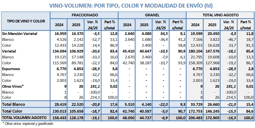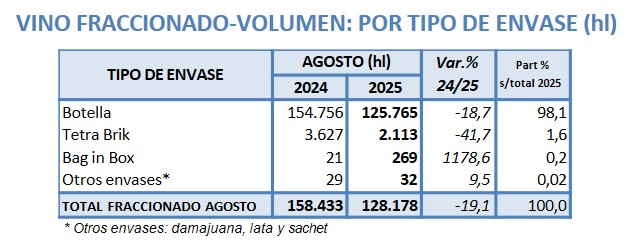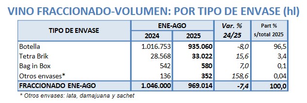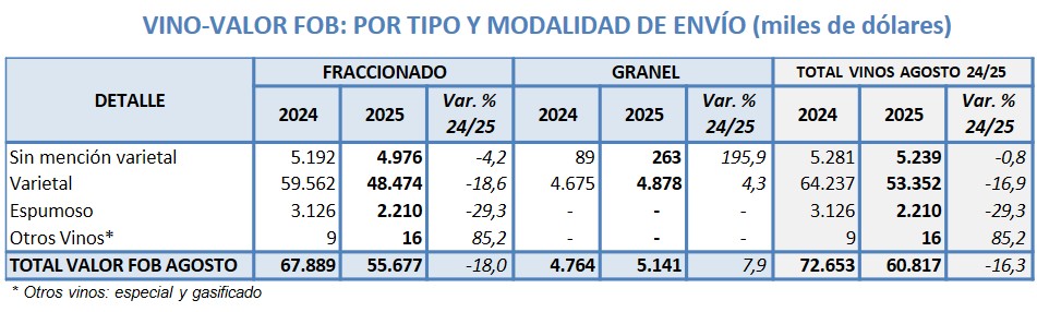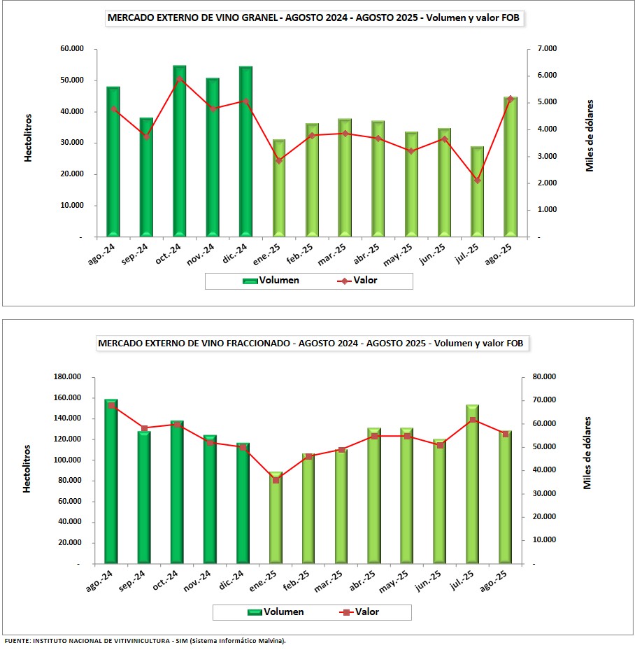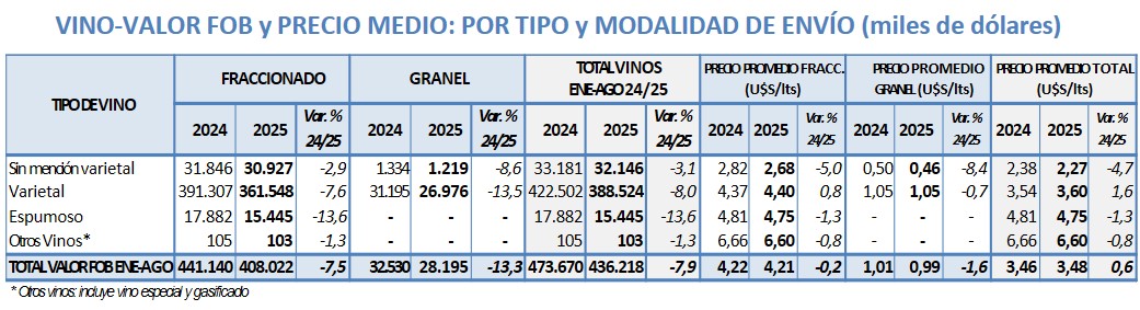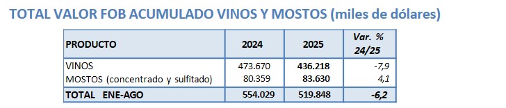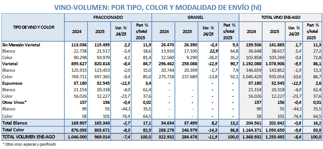De enero a agosto de 2025 Argentina exportó -8,4% lt de vino, a un valor -7,9% respecto 2024