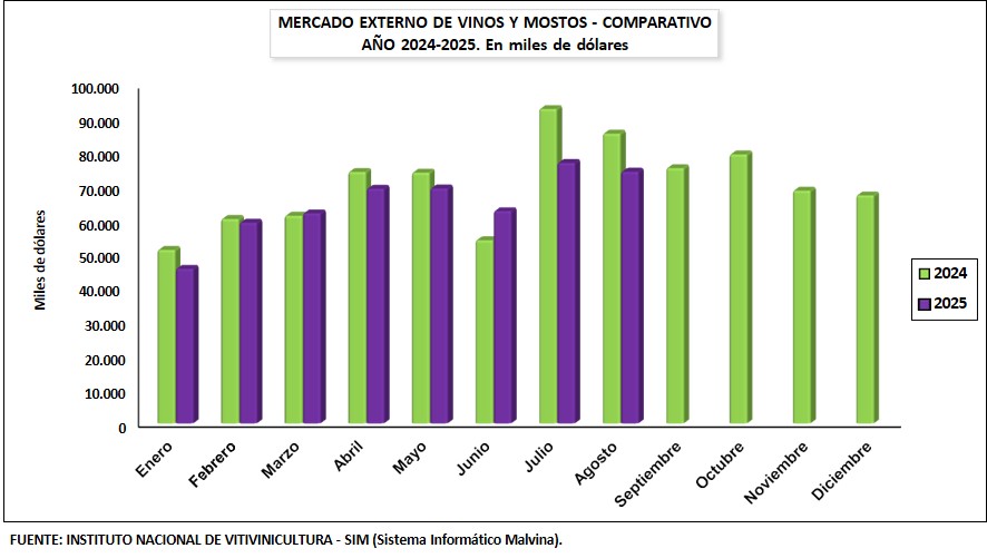 Home MERCADOS De enero a agosto de 2025 Argentina exportó -8,4% lt de vino, a un valor -7,9% respecto 2024