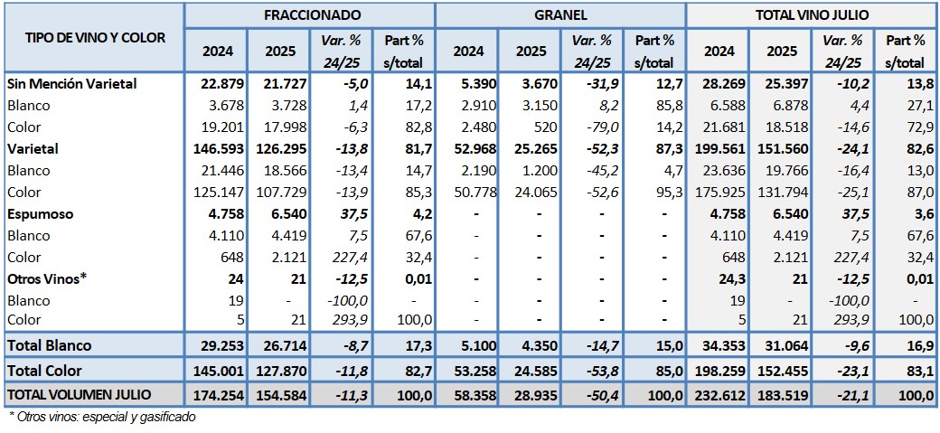 Vinos mensual (volumen): junio 2025 / julio 2025