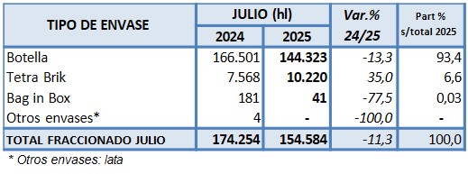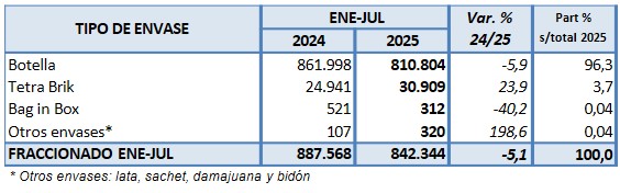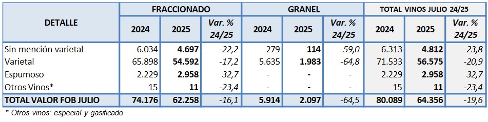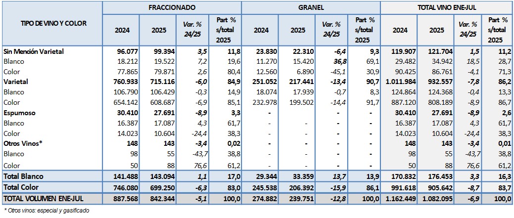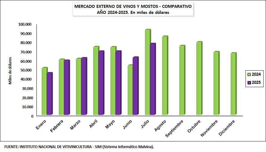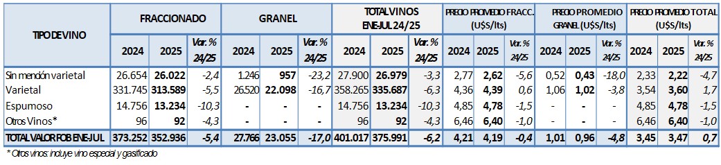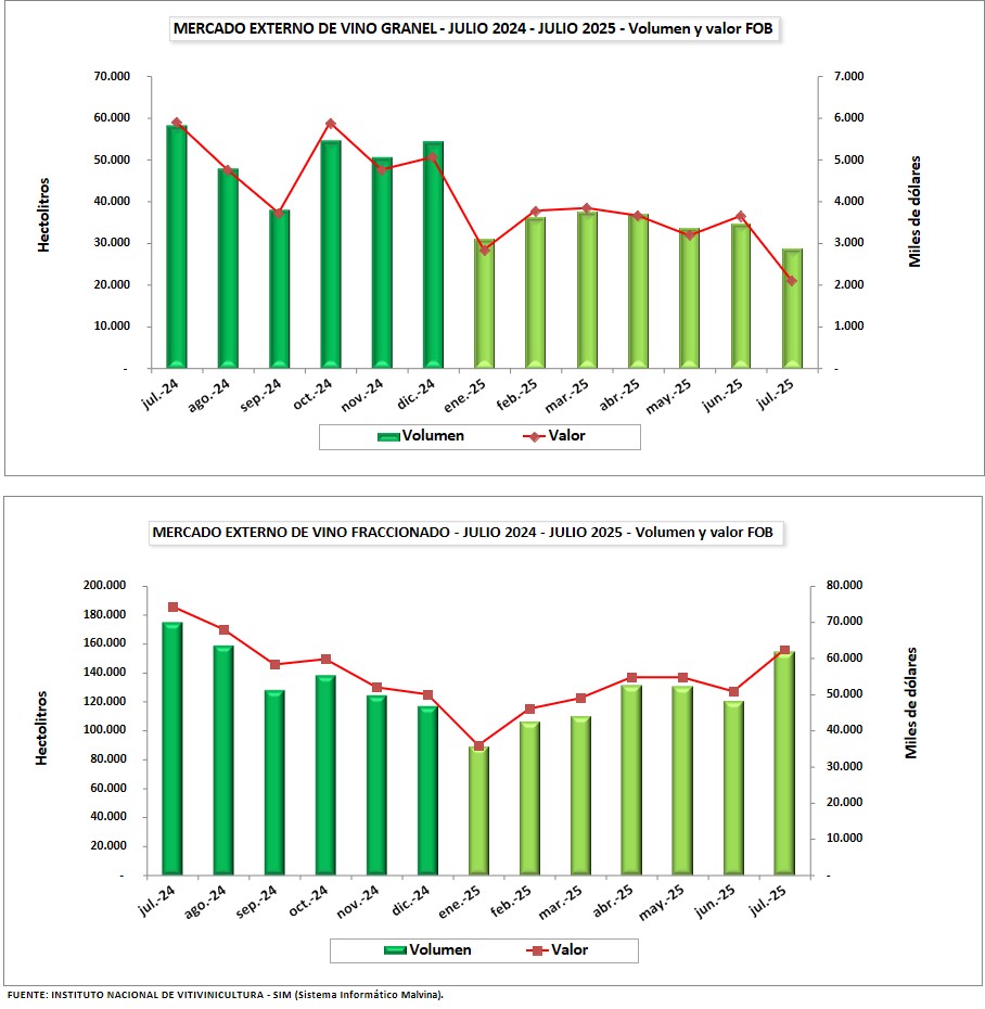 Argentina exportó entre enero y julio de 2025, 1.082.095 litros de vino (-6,9 % que en 2024), a un valor FOB de U$S 375.991.000 (-6,2%). De ese total, 842.344.000 litros corresponden a vinos fraccionados (-5,1%) y 239.751.000 litros a vinos a granel (-12,8%).